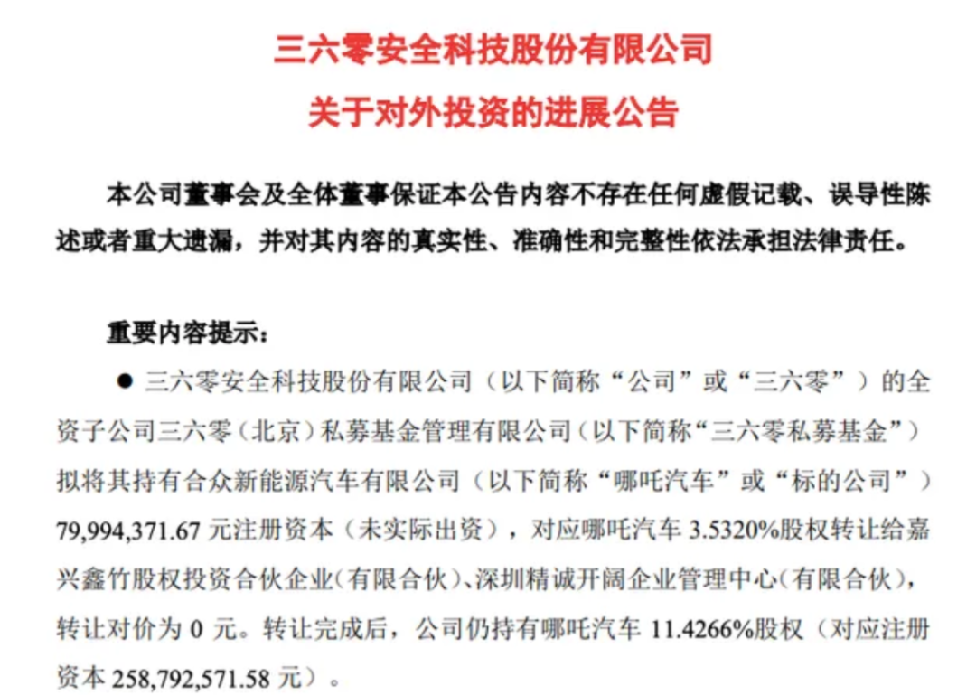 2021年,哪吒汽车D1轮融资到手40亿。这轮融资正是由三六零公司领投。据三六零公司2021年10月26日发布的“公告”显示,当年其对哪吒汽车的投资总额共计29亿元。