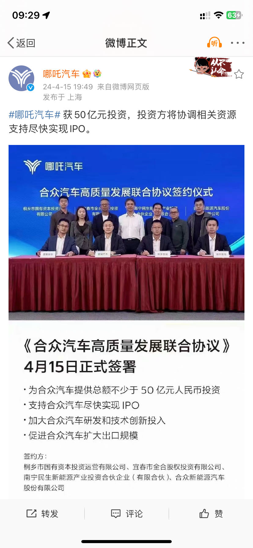 4月15日,哪吒汽车官方微博于19点49分发布消息称,“#哪吒汽车# 获50亿元投资,投资方将协调相关资源支持尽快实现IPO。”