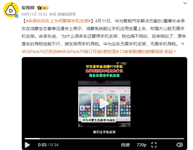 在发布智界S7时,余承东笑称,“一开始想不明白为什么很多人还用手机支架,后来我明白了,是因为他们车的导航性能不行,需要用手机导航。”他表示,用华为鸿蒙智行的车,无需手机支架。