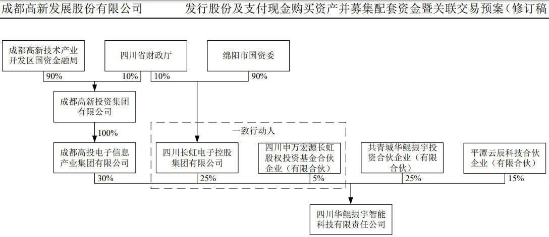 回顾起来,2023年10月18日,高新发展披露,拟通过发行股份及支付现金的方式购买成都高投电子信息产业集团有限公司(简称“高投电子集团”)、共青城华鲲振宇投资合伙企业、海南云辰合业科技合伙企业(2024年1月平潭云辰科技合伙企业已更名为“海南云辰合业科技合伙企业”)合计持有的四川华鲲振宇智能科技有限责任公司70%的股权,并募集配套资金。