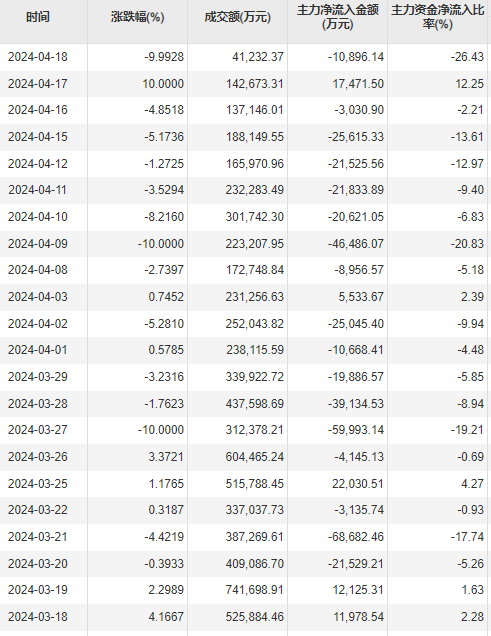 4月18日,高新发展(000628.SZ)竞价跌停,封单金额超8亿元。截至当日收盘,该股票未打开跌停板,当日成交额4.12亿元,主力资金净流出1.09亿元。