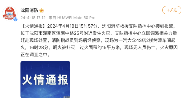 沈阳消防通报,4月18日15时57分,沈阳消防救援支队指挥中心接到报警,位于沈阳市浑南区浑南中路25号附近发生火灾,支队指挥中心立即调派相关力量赶赴现场处置。消防指战员到场后经侦察,现场为一汽大众4S店2楼烤漆车间起火,16时28分,明火被扑灭,过火面积约15平方米,现场无人员伤亡,火灾原因正在调查之中。