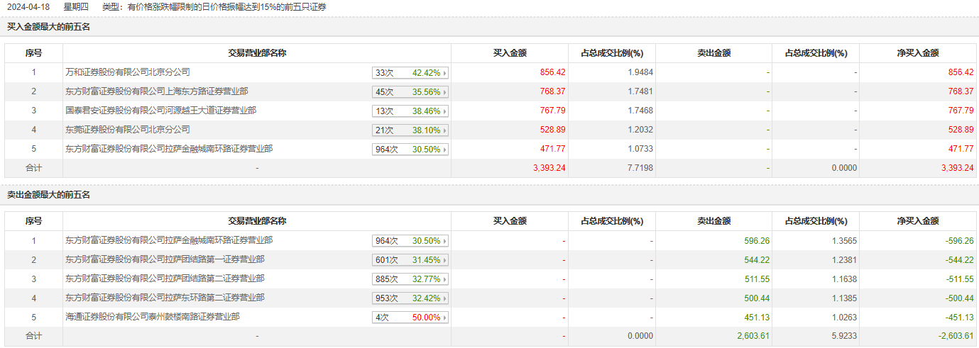 具体来看,知名游资现身龙虎榜,著名刺客(东莞证券股份有限公司北京分公司)净买入528.89万元。此外,万和证券北京分公司、东方财富证券上海东方路证券营业部分别买入856.42万元、768.37万元;东方财富证券拉萨金融城南环路证券营业部、东方财富证券拉萨团结路第一证券营业部分别卖出596.26万元、544.22万元。
