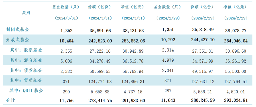相比2月份,公募基金的总数量继续攀升,达到了11756只,总份额和净值规模变动不大。2月底,公募净值规模为29.3万亿元,3月份规模减少了0.1万亿元,为29.2万亿元,而份额则减少了0.18亿份。