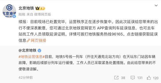 @北京地铁 微博消息,目前现场已处置完毕,运营秩序正在逐步恢复中。此前,北京地铁发文称,地铁5号线一列车(开往天通苑北站方向)在天坛东门站因车辆故障,影响后续部分列车运行缓慢,工作人员已采取紧急处置措施。