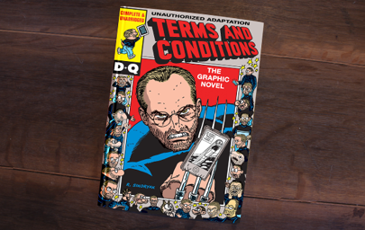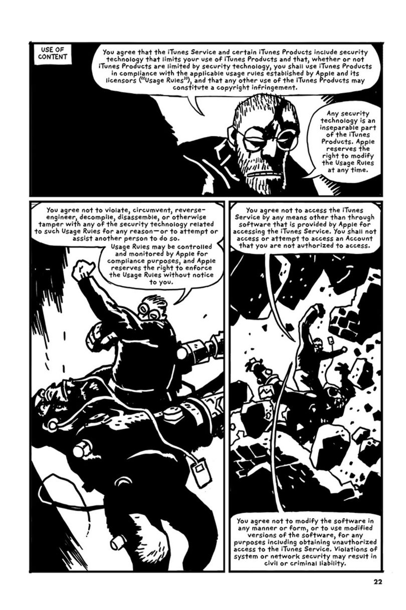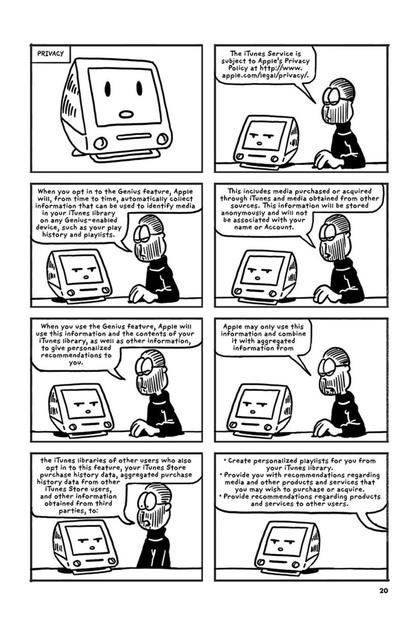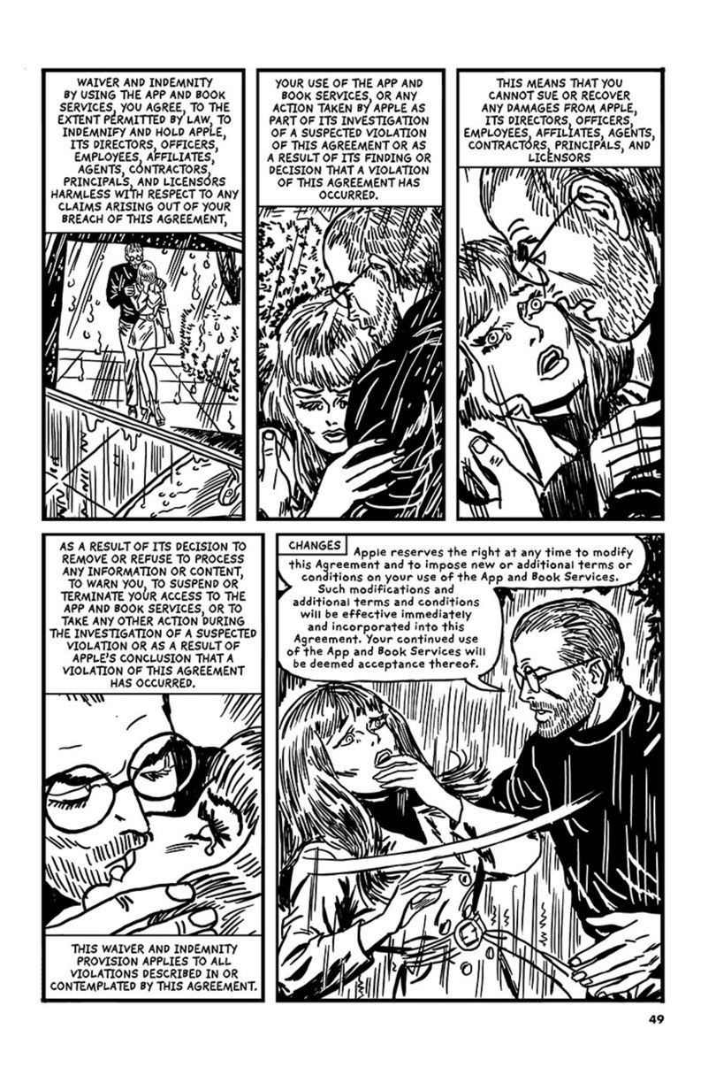 不过,Sikoryak聪明的地方在于,他找到了苹果公司这样颇具知名度的品牌背书,容易引发读者的兴趣;而漫画版服务条款的内容设置,又在满足好奇心的同时也降低了阅读门槛。苹果公司一直都没有对他的行为作出回应,这也是Sikoryak的担忧所在——如果苹果公司出面阻止,那么他很有可能无法将这个系列持续下去。