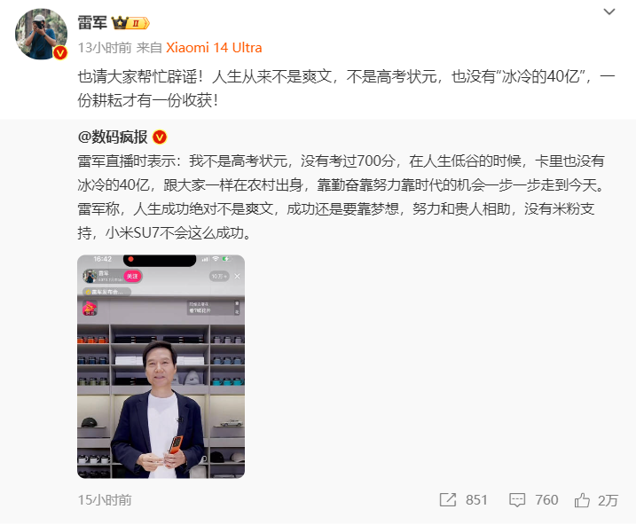 这一波花式吹捧,搞得正主都晕头转向。4月18日的直播里,雷军说得知自己成了爽文男主,“全身都不舒服”。他呼吁大家替他辟谣,必要的时候小米公关部也会出动,“我不是高考状元,没有考过700分,人生低谷的时候,我的卡里也没有冰冷的40亿”。
