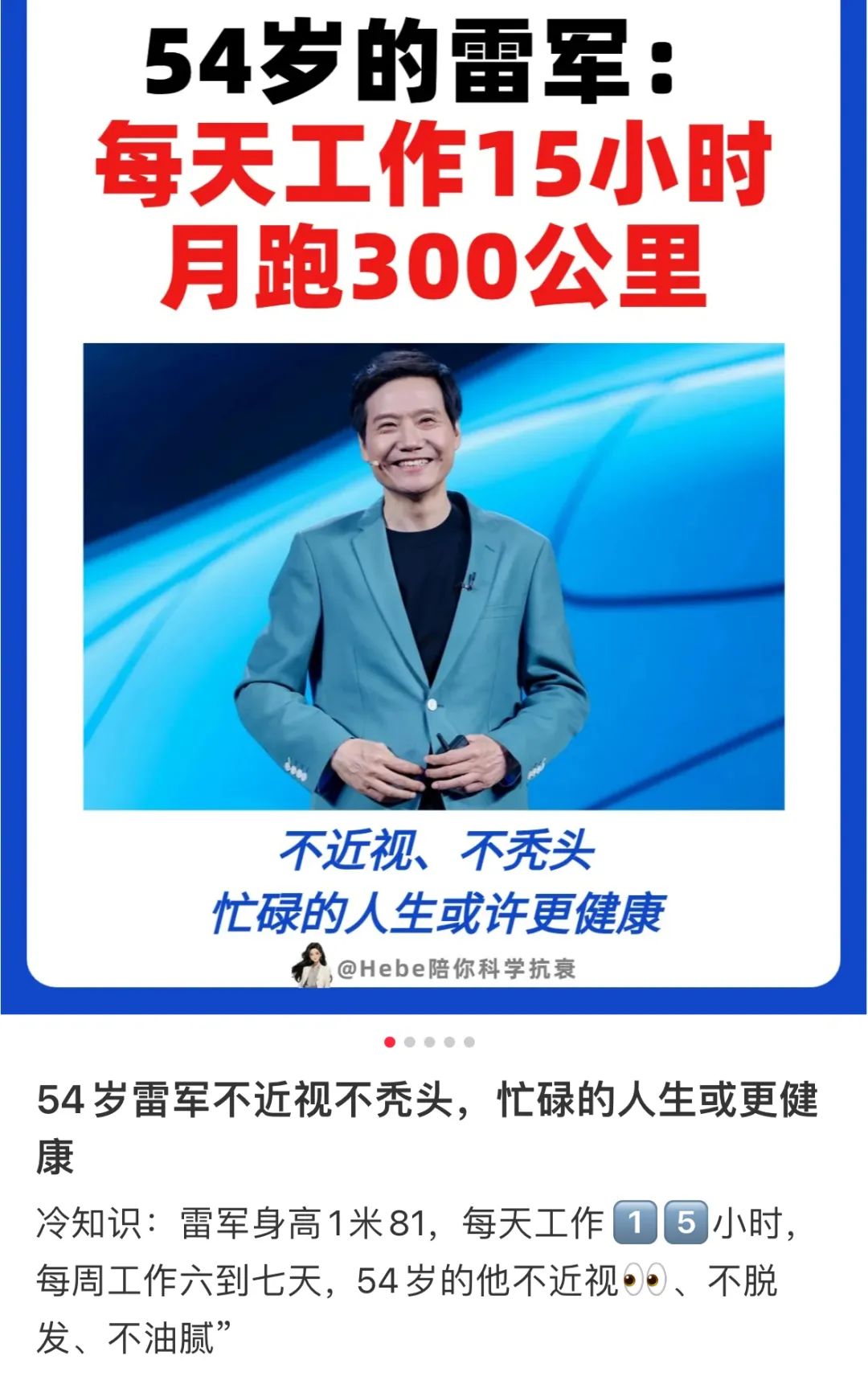 宣传抗衰的健康博主,晒出雷军笑得志得意满的照片当广告——54岁,不近视、不脱发、不油腻,靠的就是每天晨跑10公里。全然不提造车成功之前,疑似“断崖式衰老”的对比。