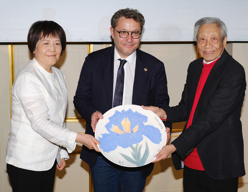 中法双方代表互赠了陈家泠先生创作的“蓝色鸢尾花”瓷盘、上海城市形象官方电子画册、“两河对话”主题丝巾等特色礼物。