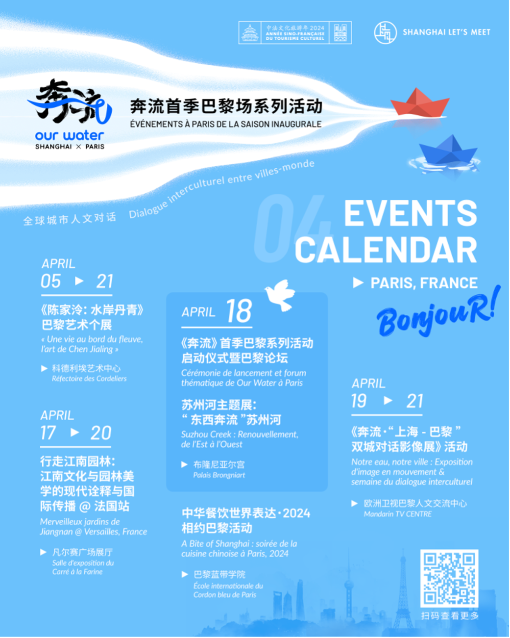 《奔流》首季巴黎场系列活动自4月5日起,持续18天,包括巴黎论坛、“水岸丹青:陈家泠艺术展”、“行走江南园林”巡展法国站、“东西奔流”苏州河主题展、“一条河与一座城”双城对话影像艺术展、“中华餐饮世界表达·2024相约巴黎”等主题活动。
