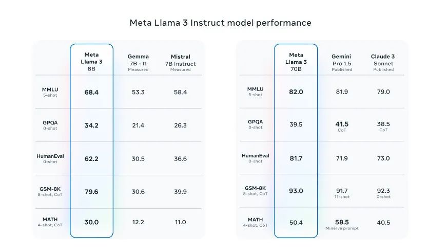 从上图不难看出,Llama 3 8B的成绩在九项测试中领先同行,其中Gemma-7B模型于今年2月发布,一度被称为全球最强开源大模型。Llama 3 70B则在MMLU、HumanEval和GSM-8K上战胜了Gemini 1.5 Pro,同时在五项测试上全面优于Claude 3系列的中杯模型Sonnet。