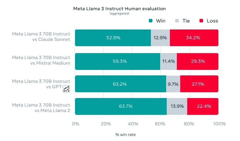 测试数据显示,70B 版本的 Llama 3 在指令调优后,在对比 Claude Sonnet、Mistral Medium、GPT-3.5 和 Llama 2 的比赛中,其胜率分别达到了 52.9%、59.3%、63.2%、63.7%