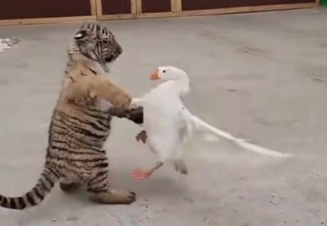 △被大鹅欺负的小老虎“奶豆”(图源:临汾市动物园)