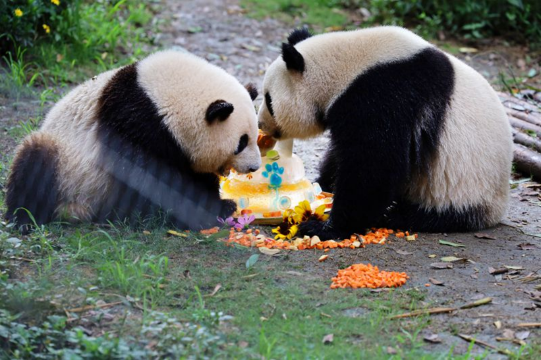 △大熊猫“和花”和“和叶”同框吃生日蛋糕(小赞 摄)
