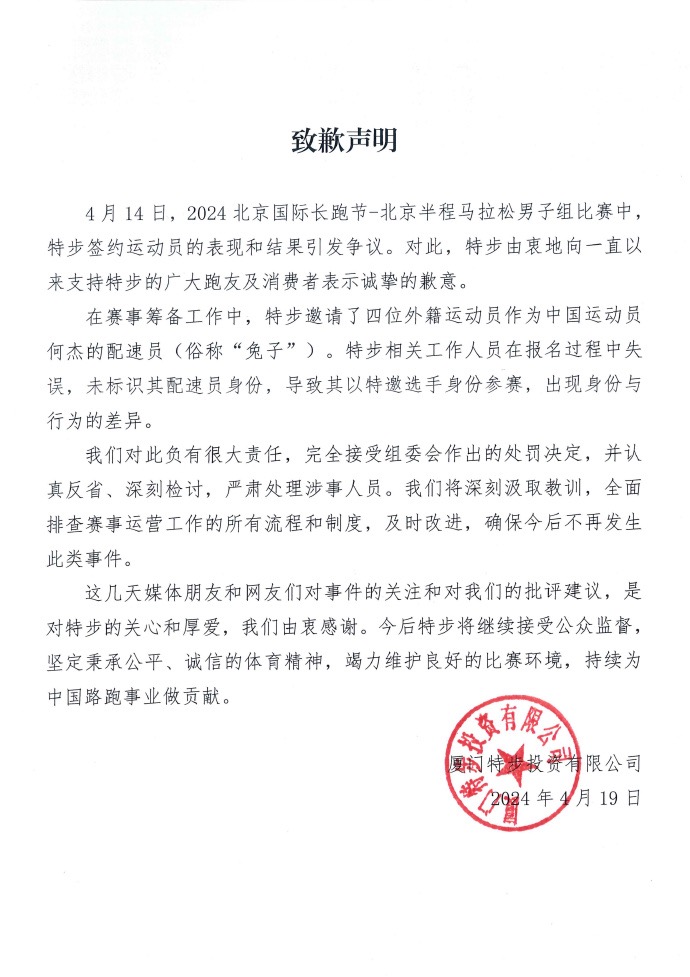 4月19日,@特步 就北京半程马拉松赛发布致歉声明称,在赛事筹备工作中,邀请了四位外籍运动员作为中国运动员何杰的配速员。特步相关工作人员在报名过程中失误,未标识其配速员身份,导致其以特邀选手身份参赛,出现身份与行为的差异。