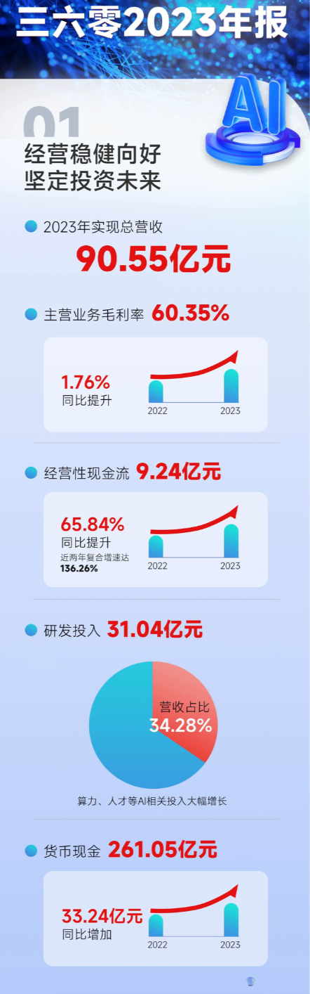 4月19日,三六零集团(601360.SH,下称“360”)发布2023年报。报告期内,公司实现营业收入90.55亿元,主营业务毛利率60.35%,同比提升1.76%。归属于上市公司股东的净利润-4.92亿元,较2022年大幅减亏77.65%。经营性现金流净额9.24亿元,较去年同比提升65.84%,近两年复合增速达136.26%,整体经营态势稳健向好。