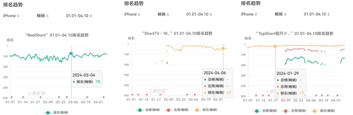 图/TopShort、Reelshort、ShortTV日本市场畅销榜排名,来源/七麦数据