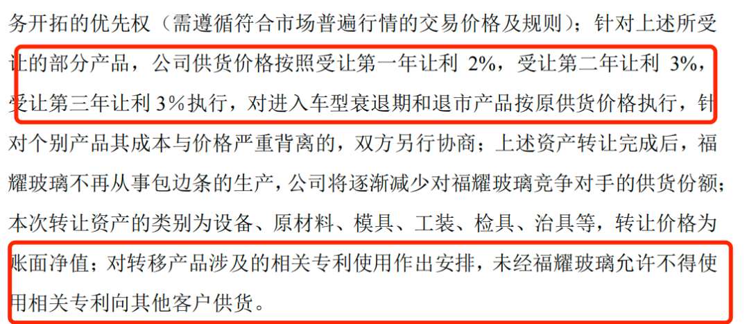 此外,对转移产品涉及的相关专利使用安排,未经福耀玻璃允许,科力股份不得使用相关专利向其他客户供货。