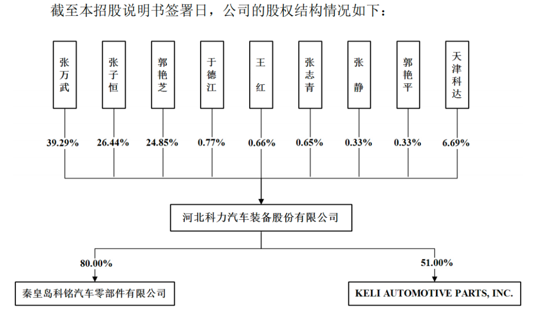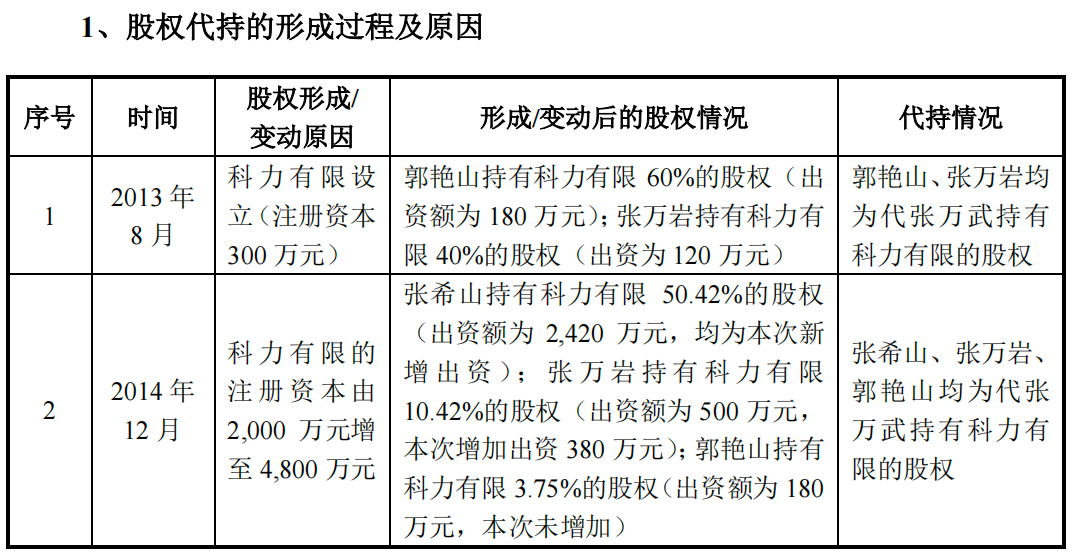 招股书显示,2013年8月,科力股份的前身科力有限设立时,张万武委托其妹张万岩、其妻郭艳芝的弟弟郭艳山代为出资。其中,郭艳山持有科力有限60%的股权;张万岩持有科力有限40%的股权。