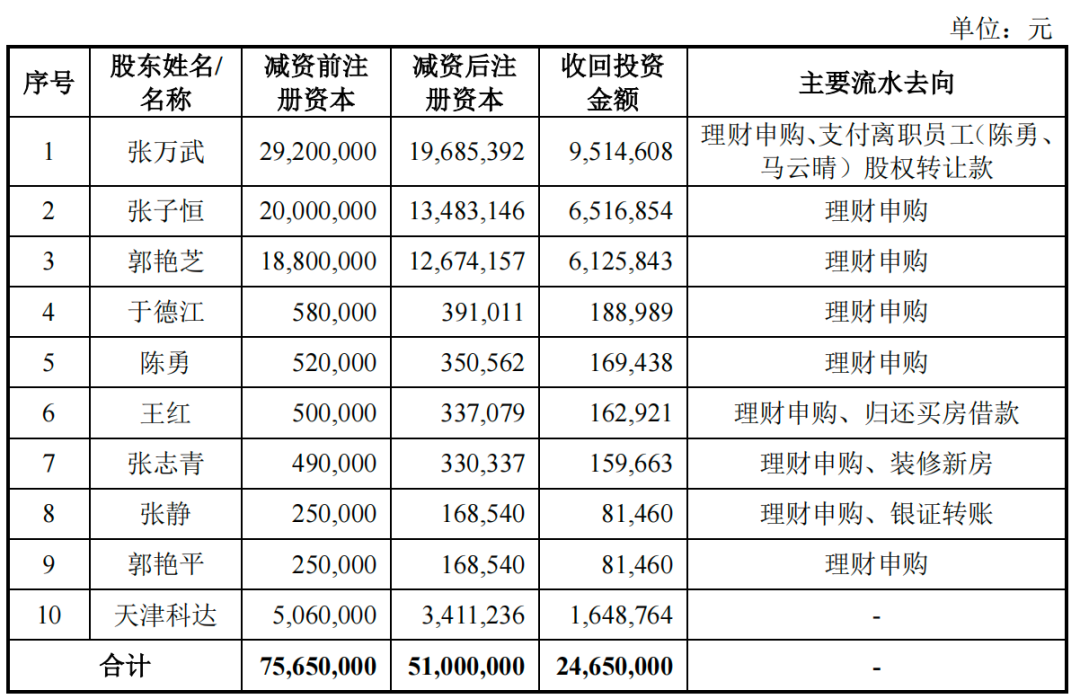 科力股份的收回投资金额总计2465万元。其中,通过减资,张万武一家三口套现2215.73万元,并且主要用于理财申购等用途。