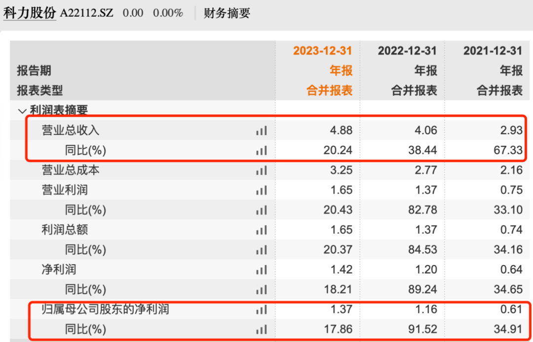 2021年-2023年(以下简称“报告期”),科力股份业绩持续增长,营业收入分别为2.93亿元、4.06亿元和4.88亿元,同比增长率分别为67.33%、38.44%和20.24%;同期归母净利润6073.15万元、1.16亿元和1.37亿元,同比增长率34.91%、91.52%和17.86%。