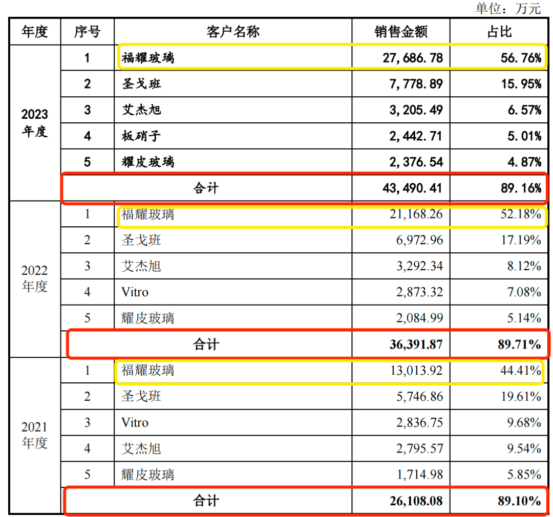 招股书显示,福耀玻璃是科力股份的第一大客户,报告期内,科力股份向福耀玻璃的销售收入分别为1.3亿元、2.12亿元和2.77亿元,占当期销售金额的比例为44.41%、52.18%和56.76%,占比越来越高。