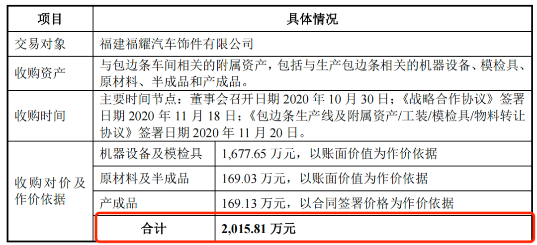 2020年11月,科力股份收购福耀玻璃全资附属企业福耀饰件的包边条车间相关资产,包括机器设备、模检具、存货等,收购对价为2015.81万元。