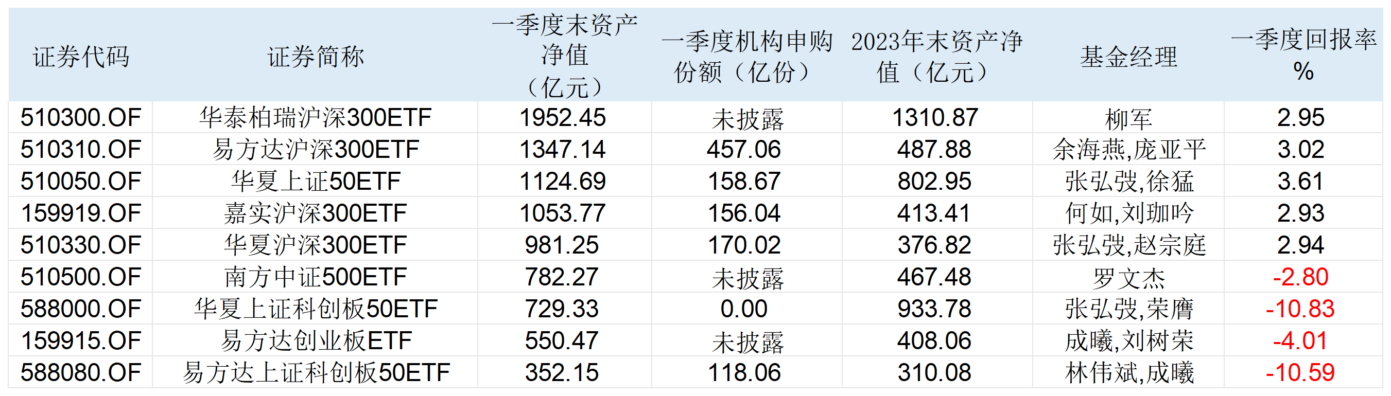 截至4月20日晚间,已经有易方达沪深300ETF、华夏上证50ETF、嘉实沪深300ETF、华夏沪深300ETF等多只核心宽基ETF披露了一季度报告。其中,易方达沪深300ETF在一季度被机构申购了457.06亿份,截至一季度末,该单一机构持有占比达到了65.74%。