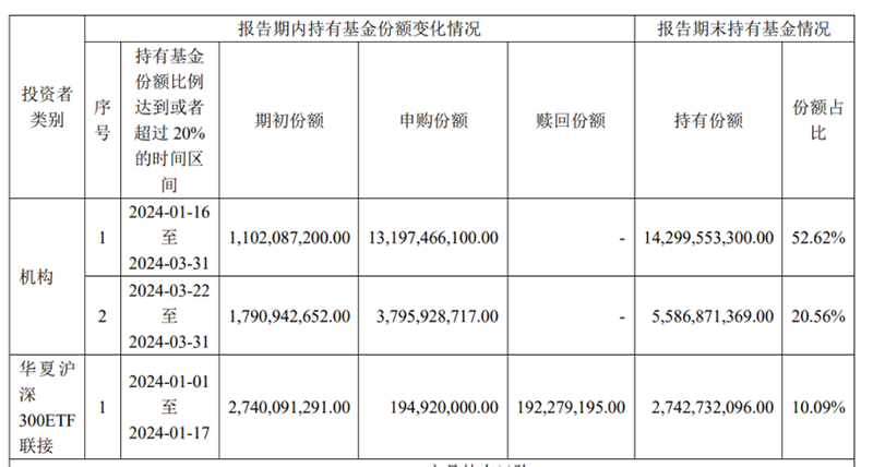 同样的事情还发生在华夏沪深300ETF。该基金一季报显示,机构1、机构2期初持有华夏沪深300ETF份额分别为11.02亿份和17.91亿份。 根据华夏沪深300ETF的年报,截至2023年底,中央汇金投资有限责任公司持有华夏沪深300ETF 28.93亿份,位列第一大持有人,同上述机构合计持有的份额完全相同。
