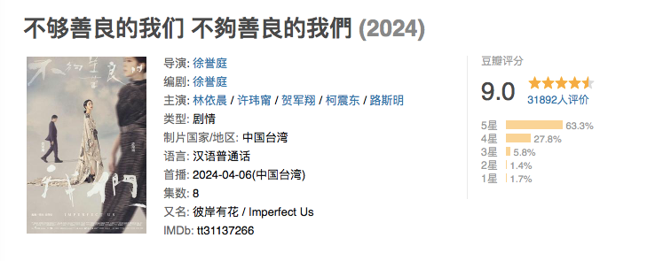 这就是已开播两周的台剧《不够善良的我们》。在台湾首播后,该剧就在公视、MyVideo、爱奇艺国际站、八大戏剧台等平台横扫四项收视冠军。口碑方面,豆瓣开分8.5、然后一路上涨,目前播出4集、评分高达9分,登顶“一周华语剧集口碑榜”,在内地也掀起追剧热潮。