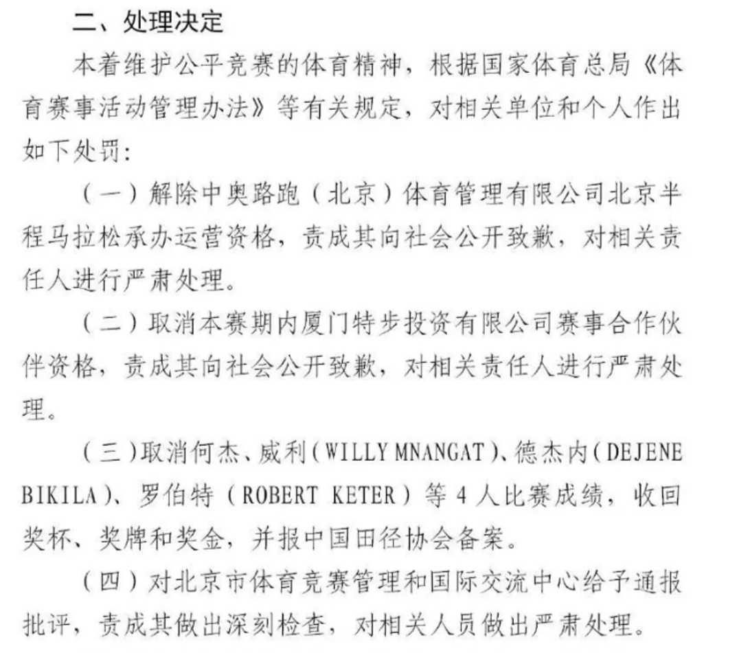 4月19日,北京马拉松赛事官网公布处理结果:对涉事相关单位和个人进行处罚,取消何杰、威利、德杰内、罗伯特等4人比赛成绩,收回奖杯、奖牌和奖金。