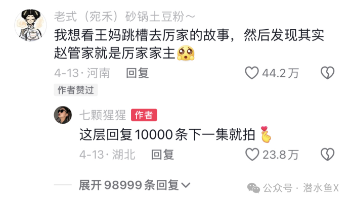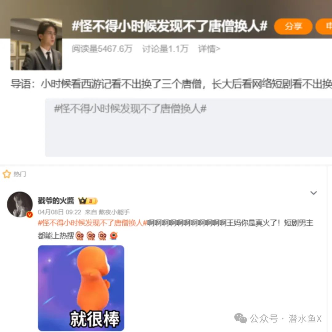 这揭示了剧情号将吐槽短剧作为长期赛道的种种可能性:它能极大程度缓解选题焦虑,并且不断按粉丝反馈优化后续剧情;同时,它也可以被视作一种新型的通告间,让明星、网红加入其中,互相涨粉,互相腾飞。看起来,这把火还能持续烧下去。