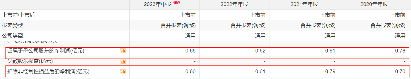 该企业IPO受理日期为2023年3月2日,审核日期为2024年3月31日,目前IPO审核状态为中止审核。若要重启IPO,摆在这家企业面前的首要问题是,2023年的业绩指标(无论是归母净利亦或扣非后净利)均要高于1亿元。截至2023年6月末,该公司归母净利为0.65亿元,扣非后净利达0.6亿元。2023年一整年业绩能否冲至1亿元及格线还是未知之数。