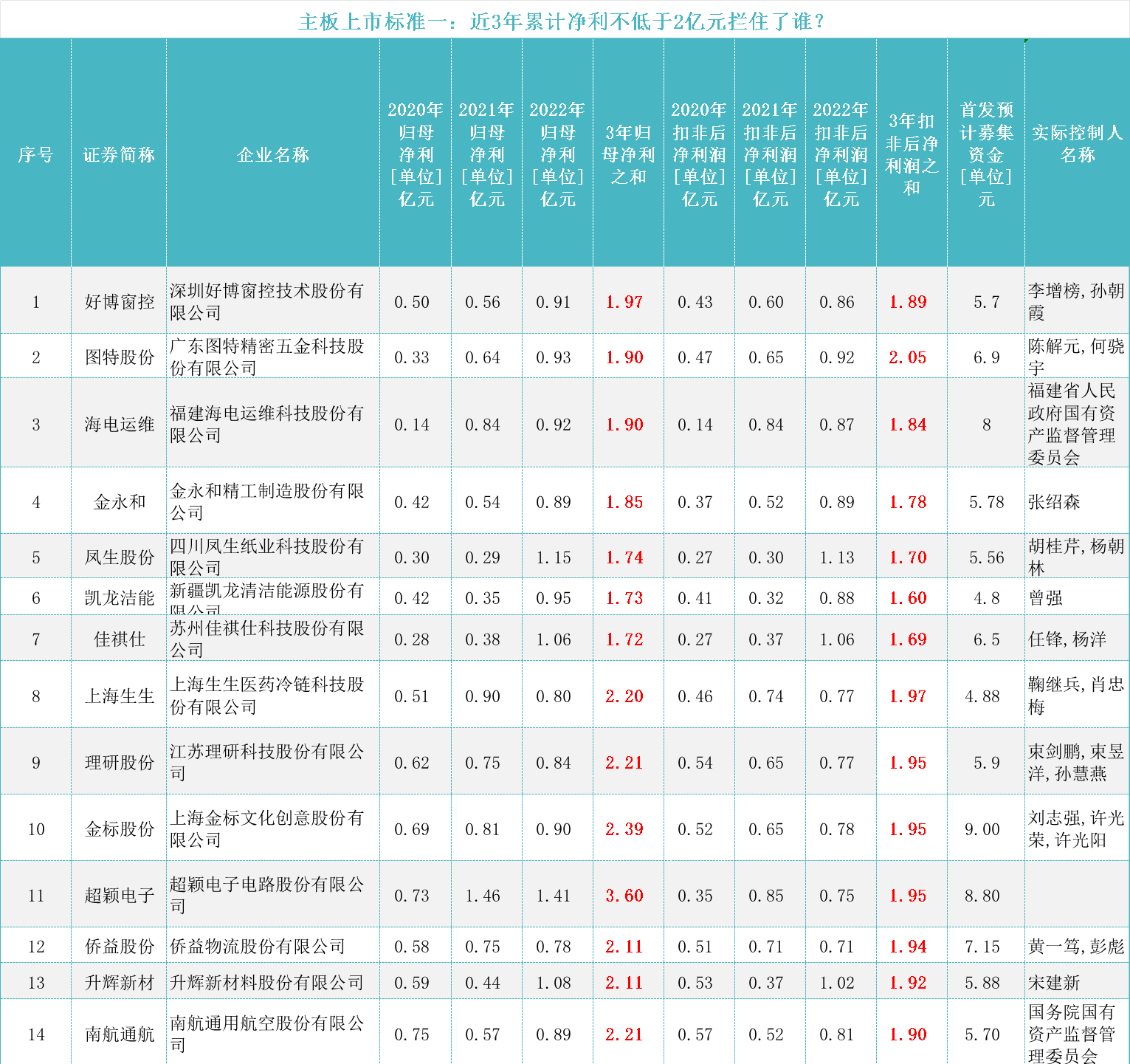 事实上,界面新闻发现,这14家公司中不少企业距离2亿元及格线并不算远。比如,福建海电运维科技股份有限公司(下称海电运维),2020年至2022年这3年报告期内累计归母净利达1.9亿元,扣非后归母净利达1.84亿元,尽管均低于“主板第一套上市考卷2亿元”的最低要求,但距离达标并不算远。