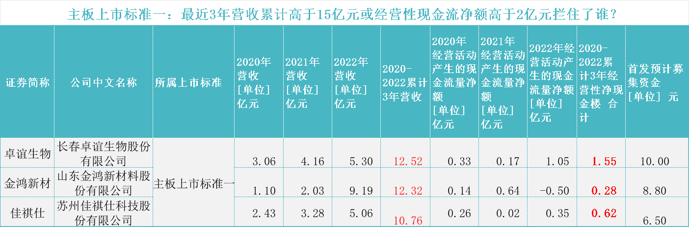 以金鸿新材为例,在老版上市规则下,虽然2020年至2022年经营活动现金流净额累计仅为0.28亿元,并不能跨越“不低于1亿元”的门槛,但是3年下来营收累计达12.32亿元,够得上“近3年营业收入累计不低于10亿元”的门槛线。