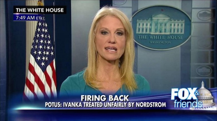 当日早上,特朗普的高级顾问康韦在白宫新闻发布室接受Fox & Friends电视节目采访时, 鼓励人们去购买特朗普最大的女儿伊万卡旗下的服装和珠宝业务。
