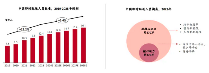 在这个万亿市场机会中,从外卖餐饮到商超货品,再到个人物品等,都可通过这种方式快速到达消费者手里。据沙利文报告统计,2023年中国即配行业订单规模达到约408.8亿单,同比增长22.8%,预计到2028年,市场规模将达到813.1亿单,未来5年保持年均14.7%的两位数增长。