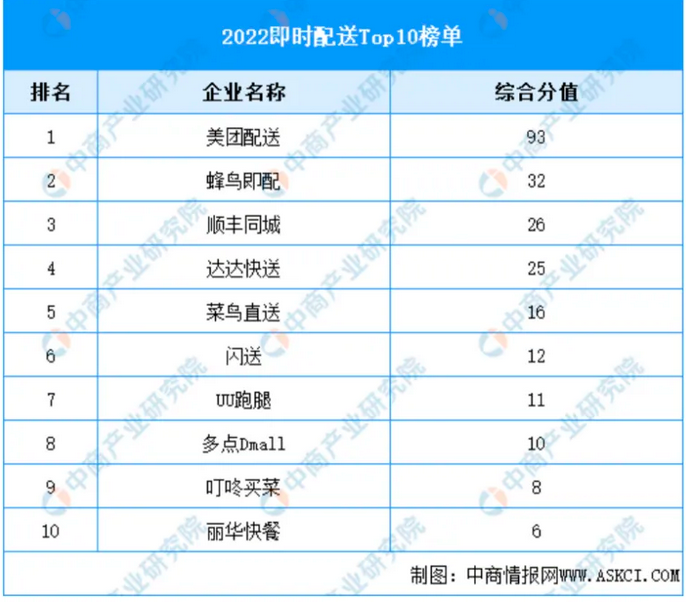 因此,目前即时配送行业已出现了内卷现象。2022年即时配送TOP10的企业里,既有美团配送、蜂鸟即配、顺丰同城等物流平台的配送业务,也有多点Dmall、叮咚买菜、丽华快餐等零售企业自营的配送业务。