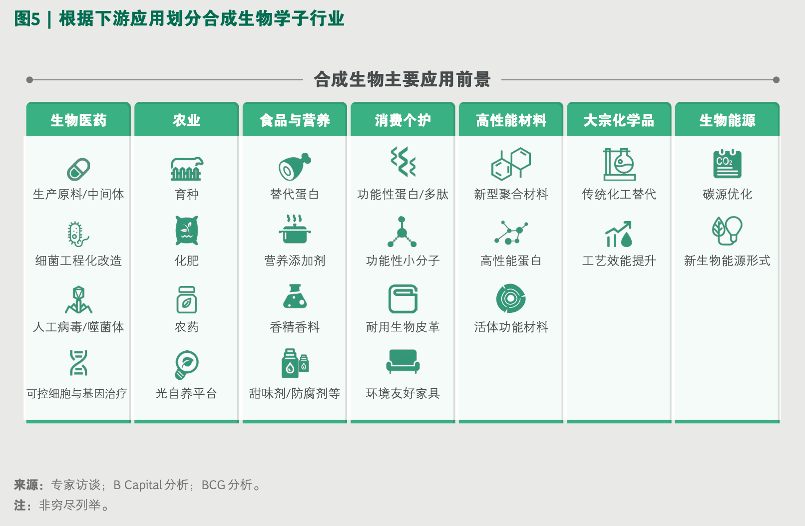 合成生物学产业链环环相扣,上游企业聚焦于势能技术开发,中游企业提供赋能型技术平台,下游企业则为各垂直行业带来创新产品。近年来,合成生物学广泛应用于新药研发、食品、消费品、农业、化工、环保等领域。
