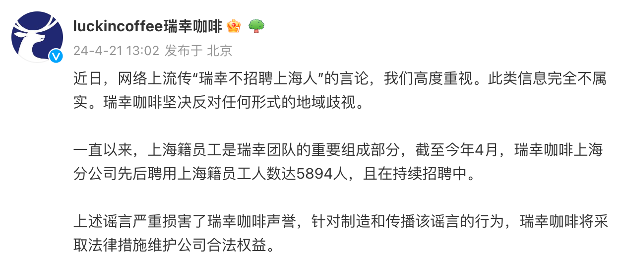 4月21日,瑞幸咖啡发文称,网传“瑞幸不招聘上海人”言论不实,公司坚决反对任何形式的地域歧视。瑞幸表示,一直以来,上海籍员工是瑞幸团队的重要组成部分,截至今年4月,瑞幸咖啡上海分公司先后聘用上海籍员工人数达5894人,且在持续招聘中。针对制造和传播该谣言的行为,瑞幸咖啡将采取法律措施维护公司合法权益。