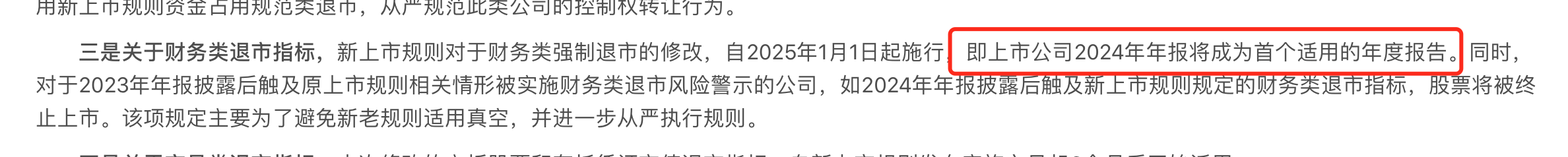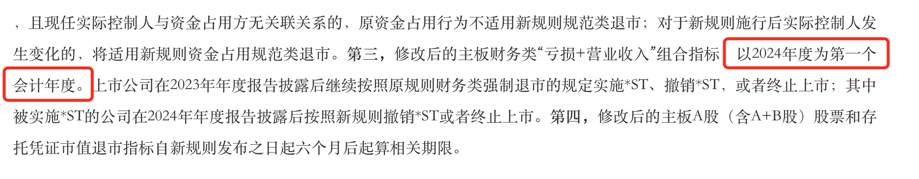 交易所表示,财务类强制退市的修改,自2025年1月1日起施行,即上市公司2024年年报将成为首个适用的年度报告。上市公司在2023年年度报告披露后继续按照原规则财务类强制退市的规定实施*ST、撤销*ST,或者终止上市;其中被实施*ST的公司在2024年年度报告披露后按照新规则撤销*ST或者终止上市。