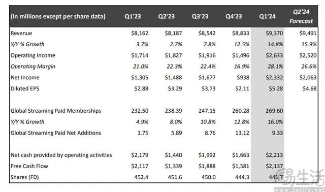 在外界看来,Netflix不再公布订阅用户规模,或许并不是因为这次财报里公布的新增订阅用户数量不及预期。恰恰相反,2024年第一季度Netflix的新增订阅用户规模达到了932万,大幅超出了华尔街分析师预期的484万,季度末订阅用户更是达到创纪录的2.696亿人。不仅仅是新增订阅用户出现爆发式增长,从各方面来看,Netflix该季度的表现可谓是极其亮眼,营收达到93.7亿美元,净利润也来到了23.3亿美元。
