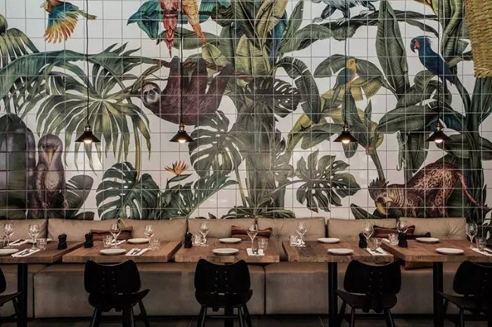 前台和餐厅处大面积的瓷砖壁画由俄罗斯艺术家 Karina Eibatova 打造,给空间增添了带着艺术气息的绿意。大量藤编桌椅、地毯,以及原木坐凳和石桌的运用给奢华中注入淳朴的元素,让整个氛围更加温馨、和谐。