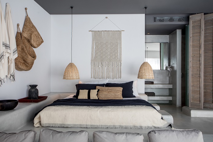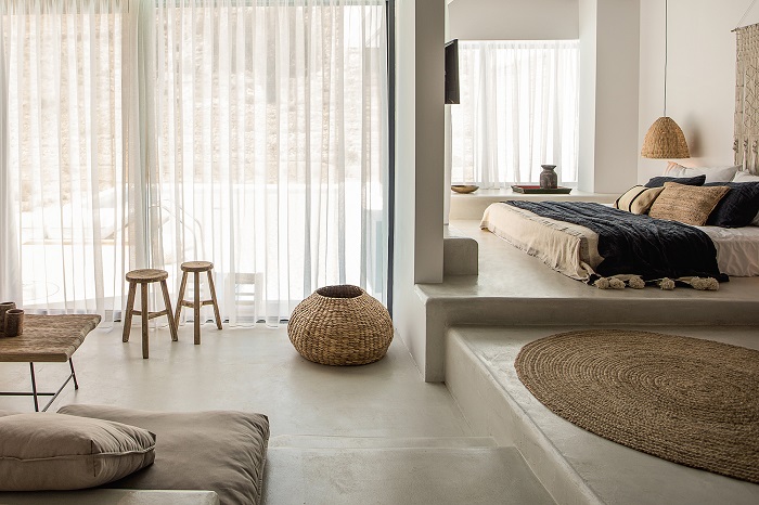客房内以乳白为底色,以藤编家饰以及大地色系的布料做装饰,仅在视觉上就很有舒适感。整体风格时尚、简约,透过大面积玻璃窗可以看到窗外泳池或是山丘景色。躺在阳台吊床上喝小酒、阅读、享受日光浴,这就是希腊之旅最惬意的打开方式。