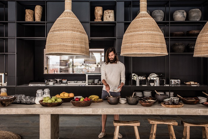 这间波西米亚风情十足的沙滩度假酒店由德国的 Lambs&Lion 操刀,著名希腊建筑师 Vana Pemar 和设计师 Annabell Kutucu 也有参与。整个空间以周围的自然景色为灵感,运用大量混凝土、木质元素以及石块来装点,与室外景色相呼应。
