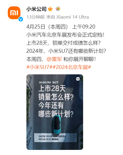 小米公司4月22日在微博表示,小米汽车北京车展发布会定档4月25日。届时雷军将公布上市28天的锁单量及小米SU7今年的新计划。