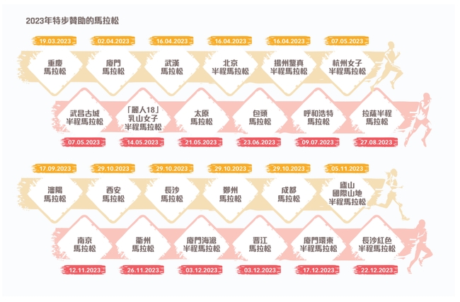 巨大的“蛋糕”摆在眼前,所有运动鞋服品牌都想分一杯羹。而特步就是第一个从“揉面”开始“做大蛋糕”的人。自2007年起,特步已累计赞助超千场马拉松赛事,是赞助马拉松赛事最多的国内运动品牌。仅2023年特步就赞助了24场马拉松赛事,其中包括连续16年赞助的世界田径白金标赛事厦门马拉松,以及重庆马拉松、扬州鉴真半程马拉松等金标赛事。