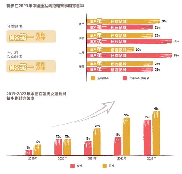 悦跑圈发布的《2024厦门马拉松赛大数据》显示,特步穿着率在所有及破三跑者中分别达到41.8%和43.8%。另据弗若斯特沙利文数据,按2023年全球各大品牌跑鞋市场零售量统计,特步品牌跑鞋销量全球领先。