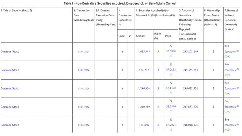 2024年2月,伯克希尔公司向SEC提交的文件显示,伯克希尔·哈撒韦分别在2月1日、2月2日、2月5日连续三个交易日加仓西方石油,加仓后,伯克希尔·公司合计持有约2.48亿股西方石油普通股,价值约141亿美元。