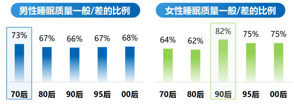 像刘阿姨这样被失眠问题困扰的中老年人并不在少数。益普索发布的《睡眠研究蓝皮书》显示,70后女性中,超过64%的人群睡眠质量一般或较差,在70后男性群体中,这一比例则达到了73%,在所有年龄段中处于最高值。